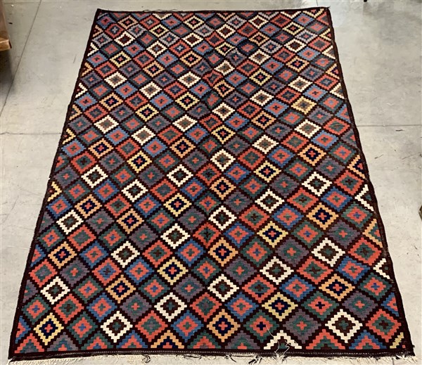 Tappeto Kilim, Turkestan occidentale, fine secolo XIX. Decoro all over con piccole losanghe policrome. (Difetti, mancanze, rapature e vecchi restauri) (cm 300x185)
