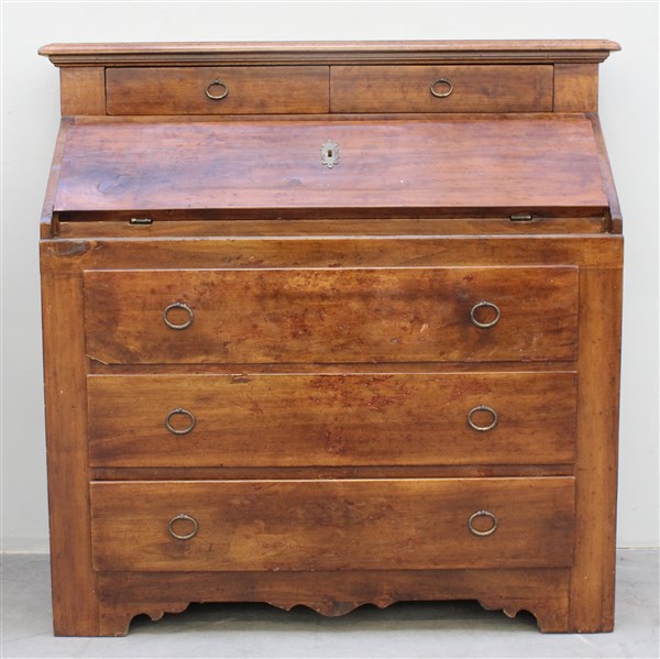 Mobile a ribalta e tre cassetti grandi e due piccoli sottopiano, con ribalta celante vno e cassetti (cm 114x112x48) (difetti)