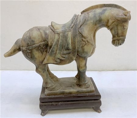 Grande cavallo in pietra dura verde poggiante su base lignea (difetti) (h. 62 c