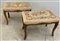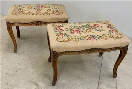 Coppia di panchetti in legno intagliato con gambe mosse e sedute in tessuto con decoro floreale a piccolo punto. (cm 61x45x37) (difetti)