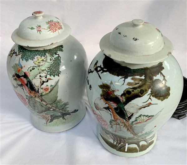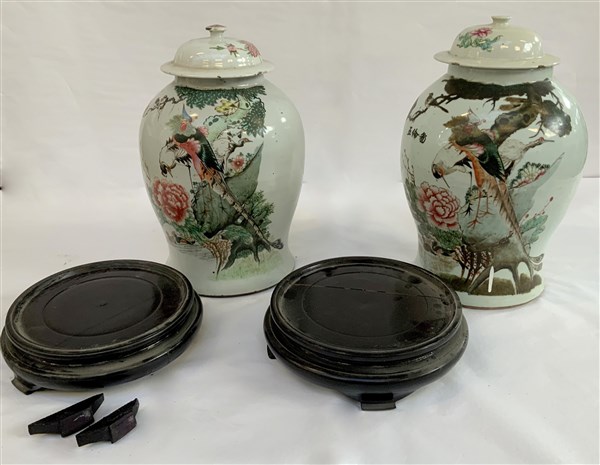 Coppia di potiches con coperchio in porcellana bianca a decoro policromo, basi in legno (difetti)