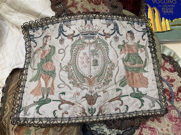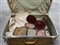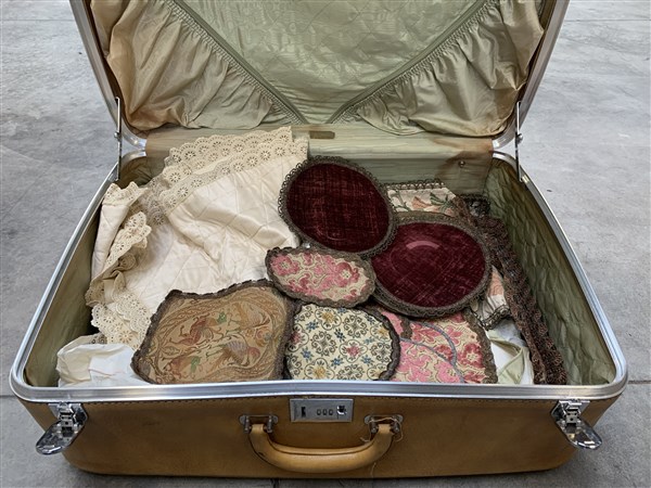 Valigia contenente numerosi tessuti, pizzi, centrini e colletti