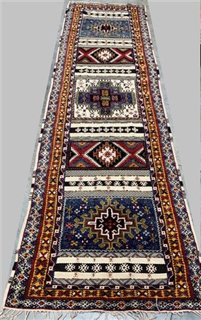 Tappeto Ourika, Marocco, Secolo XX. Doppia lavorazione, annodato e tessuto. Decoro a fasce orizzontali con medaglioni policromi. (Lievi difetti e macchie) (cm 443x117)