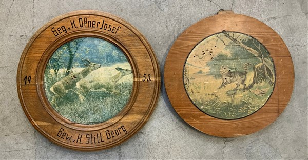 Lotto composto da due bersagli diversi in legno raffiguranti animali, uno con iscrizione e datato 1955 (d max cm 40) (difetti)