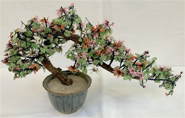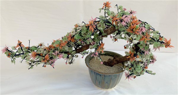 Coppia di alberi in pietra dura con cachepot in ceramica azzurra Cina, secolo X