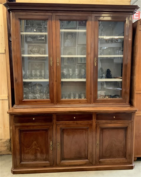 Libreria con parte superiore a tre ante e parte inferiore a tre cassetti e spportelli riquadrati (cm 193x238x54) (difetti e rotture)