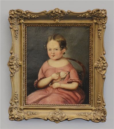 Ignoto del XIX Secolo "Ritratto di bambina con bambola" olio su cartone pressat