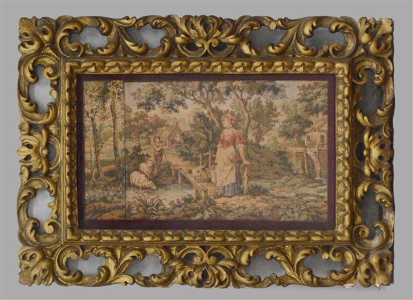 Arazzo meccanico raffigurante scena bucolica settecentesca, secolo XX, in cornice dorata. (Difetti) (cm 41x25)
