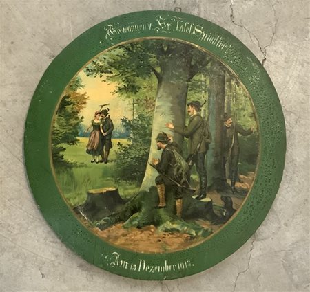 Bersaglio in legno raffigurante alpini nel bosco, con iscrizione nella bordura (d cm 50) (difetti)