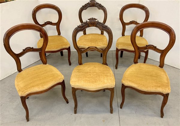 Lotto composto da un gruppo di quattro sedie con schienale a giorno e gambe anteriori mosse e una coppia di sedie con schienale a giorno e con parte superiore intagliata a motivi floreali. Secolo XIX. (difetti)