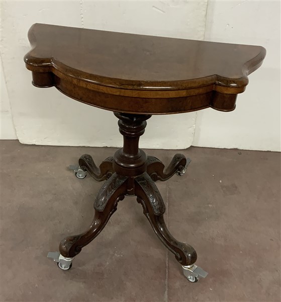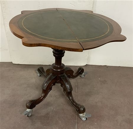 Tavolino da gioco inglese con piano radicato apribile, interno in marocchino verde impresso in oro. Gambe a sagoma, intagliate, secolo XIX munite di rotelle di epoca posteriore (cm 92x76x65) (difetti)