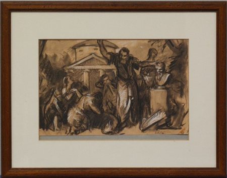 Firma indecifrata. Copia da Sebastiano Ricci "Scena mitologica" disegno a carboncino e biacca (cm 32x43) Firmato in basso a destra. Al retro: titolato e firmato. In cornice (difetti)