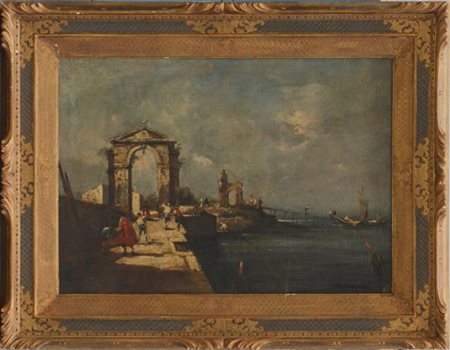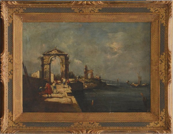 Firma indecifrata "Capriccio veneziano" olio su tela (cm 50x70) Firmato in basso a destra. In cornice