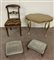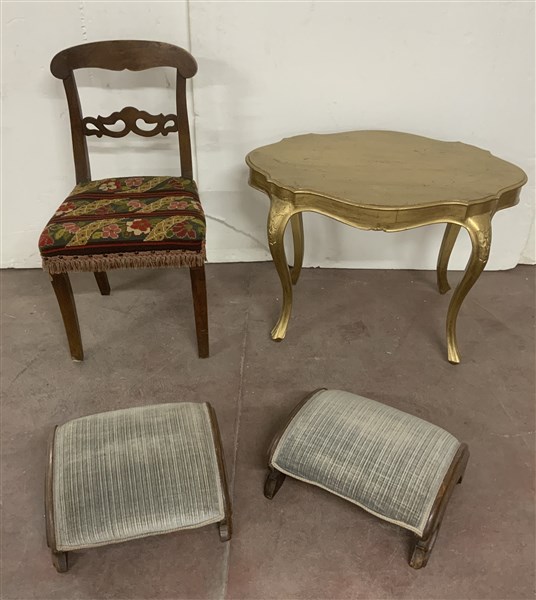 Lotto composto da una sedia da bambino del secolo XIX con seduta ricamata, due poggiapiedi rivestiti in velluto d'epoca ed un tavolino di forma mossa in legno dorato (difetti)