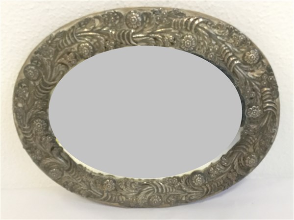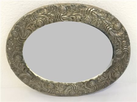 Cornice ovale con specchio in argento sbalzato a motivi floreali e cornucopie (cm 37x29) (difetti)