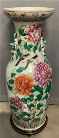 Vaso in porcellana del tipo "famiglia rosa, con base in legno (difetti e rottur
