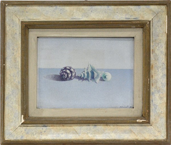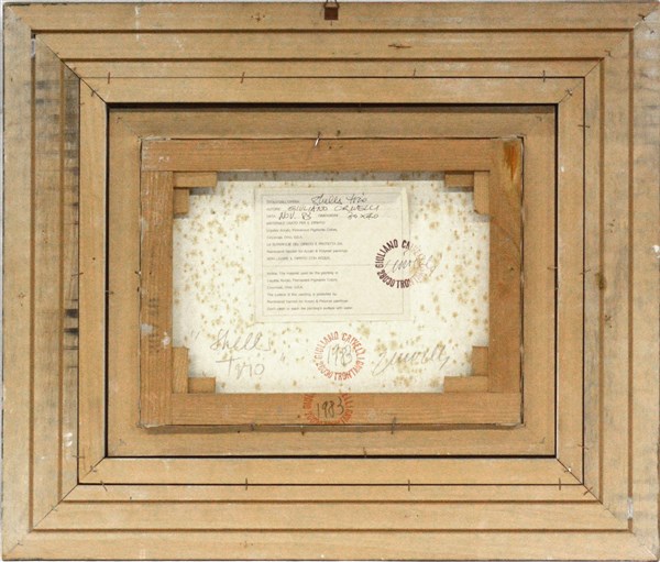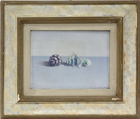 Giuliano Crivelli - "Shells trio", tecnica mista su tela (cm 30x40) firmato e datato 1983 in basso a destra; titolato e firmato al verso con etichetta dell'autore, in cornice