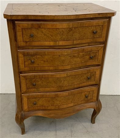 Comodino lastronato e radicato con fronte lievemente mossa a quattro cassetti (cm 51x71x35) (difetti)