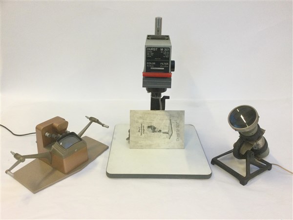 Lotto composto da un proiettore per diapositive, una moviola da tavolo per pellicola 8 mm e un ingranditore fotografico (difetti)