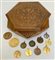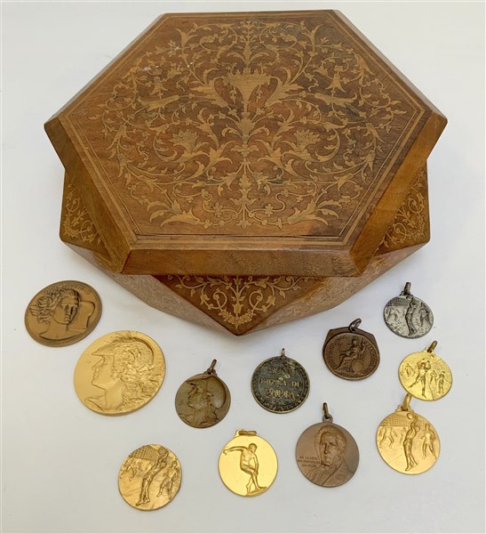 Scatola portagioie di forma polilobale in legno intarsiato a ramages, contenente alcune medaglie di soggetto vario (difetti)