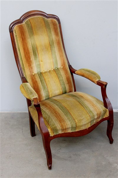 Poltrona con schienale e braccioli sagomati rivestiti in tessuto a righe, secolo XIX (difetti)