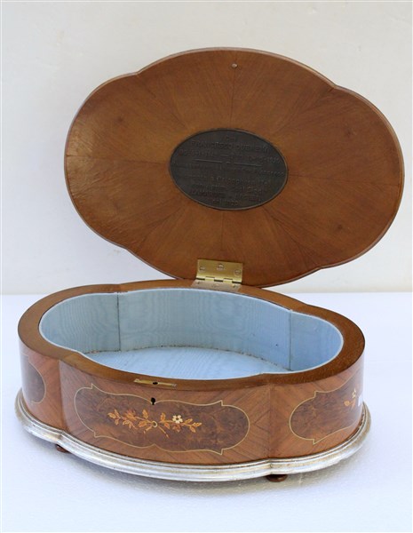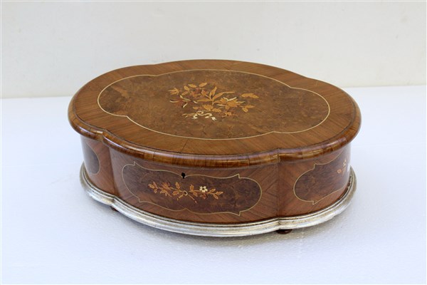 Lotto 1068 | Scatola di forma sagomata con fascia e coperchio intarsiati e filettati a motiv