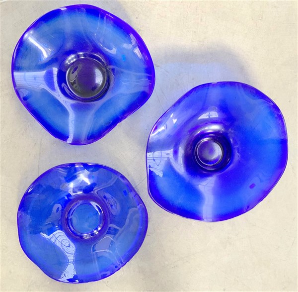 Lotto composto da tre centrotavola polilobati in vetro color azzurra-blu (cm 40x30 ca)