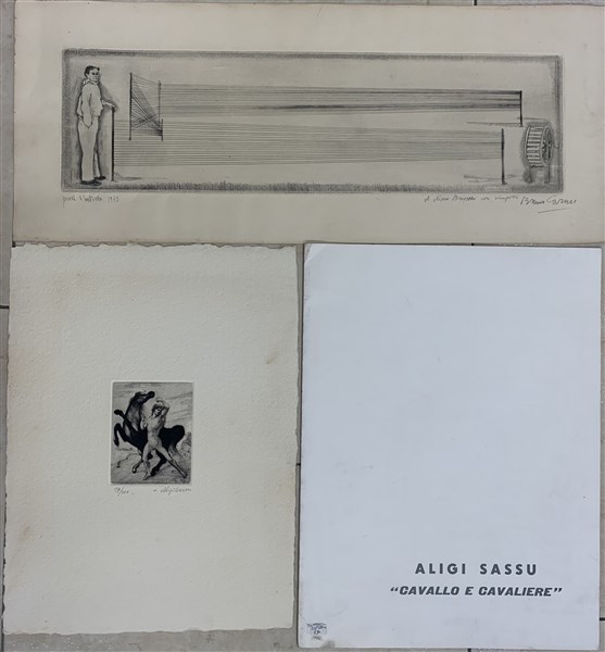 Lotto composto da un'acquaforte di Aligi Sassu raffigurante nudo e cavallo rampante e una di Bruno Caruso