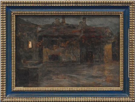 "Crepuscolo piovoso d'ottobre" olio su tavola (cm 25x35) Titolato in basso a destra. Al retro: cartiglio Raccolta Pompeo Mariani. In cornice