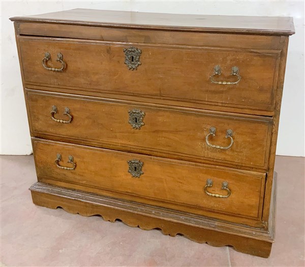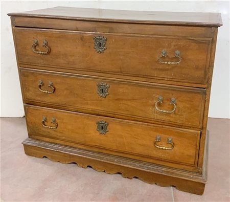 Canterano a tre cassetti con maniglie e guarnizioni in bronzo, piedi a mensola. Secolo XVIII (cm 122x96x57) (difetti e restauri)