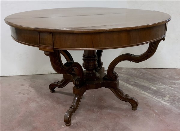 Tavolo tondo allungabile con sostegni mossi in legno intagliato e colonna centrale, secolo XIX unito a tre prolunghe di epoca posteriore (d cm 126, h cm 77) (difetti)