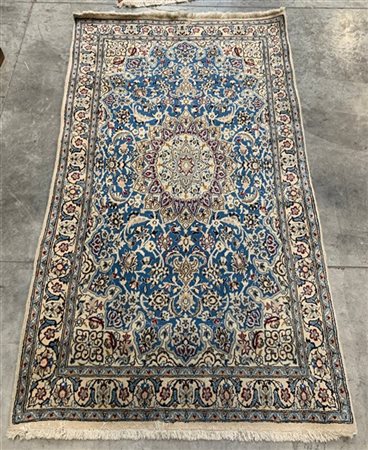 Tappeto Nain, Persia, Secolo XX. Annodato in lana e seta, decoro con medaglione a fondo bianco su campo azzurro. (Difetti e rapature) (cm 208x113)