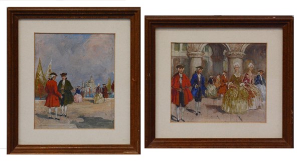 Ignoto, due dipinti ad olio su compensato raffiguranti "Scene settecentesche veneziane" (cm 15x18) In cornici