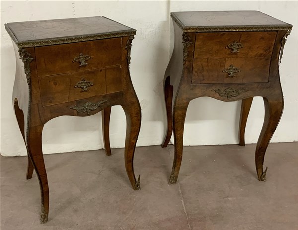Coppia di comodini di forma mossa a due cassetti lastronati in radica, decorati con profili e guarnizioni in bronzo (cm 40x69x31) (difetti)
