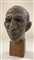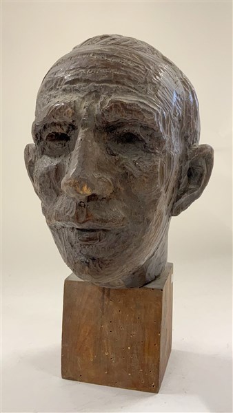 Scultura in legno raffigurante testa di uomo (h cm 27) su base in legno. firmata alla base