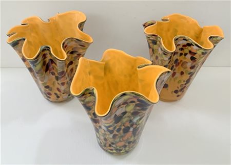 Lotto di tre vasi a fazzoletto in vetro opaco policromo con interno giallo (h cm 21)