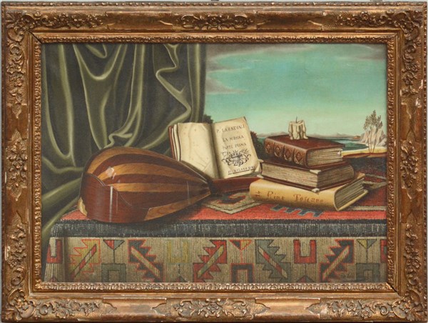 Pier Luigi Cesarini "Vita silente di mandola e vecchi libri" 1959, olio su tela