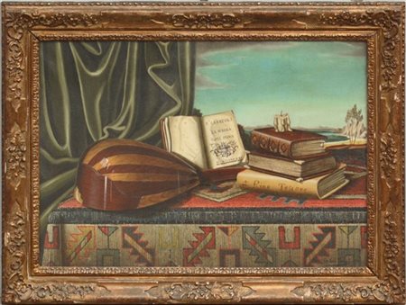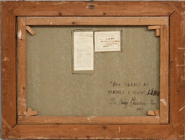 "Vita silente di mandola e vecchi libri" 1959, olio su tela (cm 50x70) Firmato e datato in basso a destra. Al retro: cartiglio del pittore, firmato, datato e titolato. In cornice