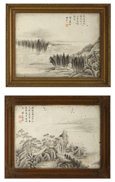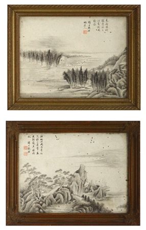 Coppia di disegni su carta raffiguranti paesaggi e recanti iscrizioni, in cornice. Cina, sec XX (difetti)