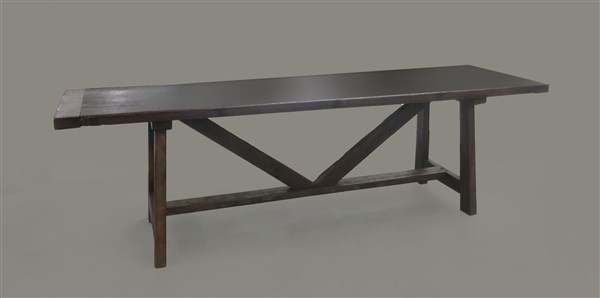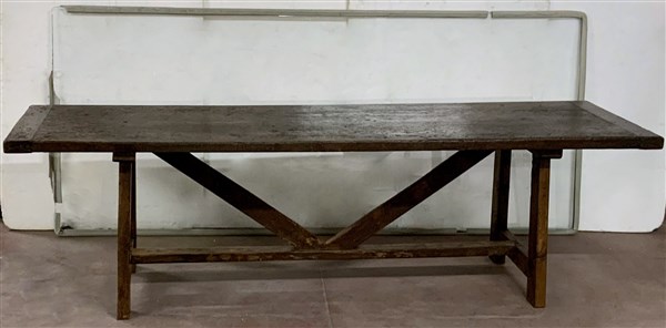 Antico tavolo ''fratino'' in legno di rovere con sostegni raccordati al centro della traversa (cm 247x73x70) unito ad un piano in cristallo (cm 260x110) (difetti)