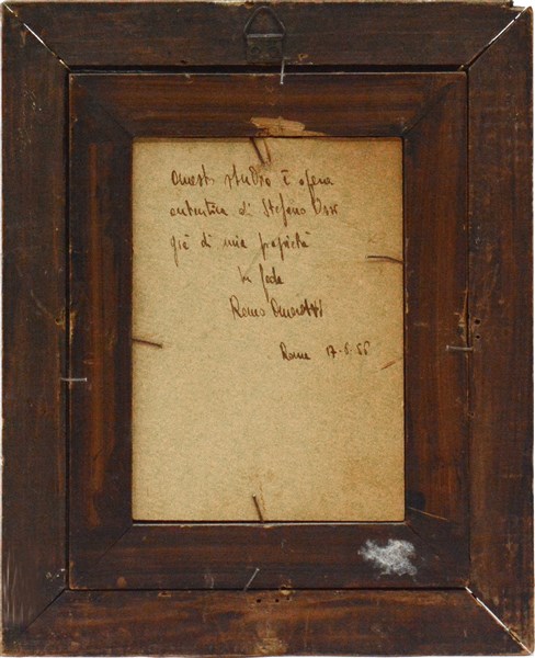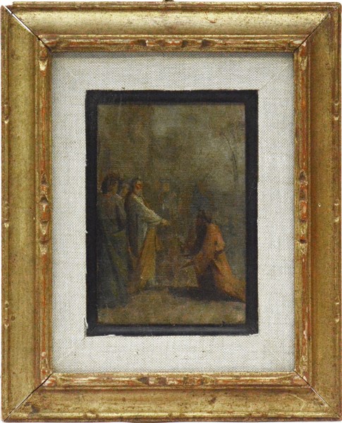 (Attribuito) "Scena biblica" olio su tela applicata su cartone (cm 12x8) Al retro: iscrizione per autentica. In cornice
