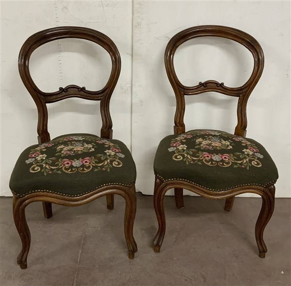 Coppia di sedie "Luigi Filippo" con schienale a giorno e seduta ricamata a piccolo punto a motivi floreali. Secolo XIX (difetti)