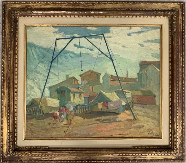 "Sosta" olio su masonite (cm 50x60) Firmato e datato '948 in basso a destra. Al retro: firmato, datato; cartiglio della I Mostra Nazionale d’Arte Contemporanea "Aprile milanese", 1948. In cornice