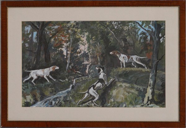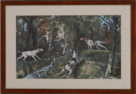 Firma indecifrata "Cani da caccia nel bosco" tecnica mista su carta (cm 43x70) Firmato in basso a destra. In cornice