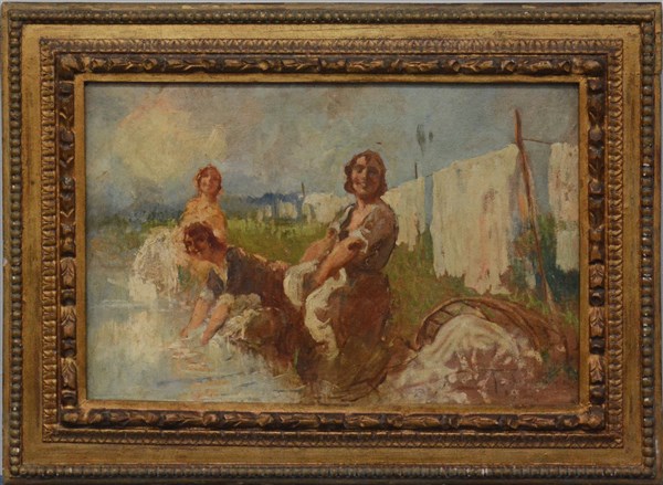 "Lavandaie" olio su tela (cm 40x60) Firmato e datato 1924 in basso a destra. In cornice (lievi difetti e restauri)