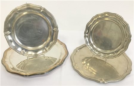 Lotto composto da quattro vassoi con bordi sagomati in metallo argentato (difet