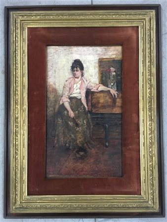 Ignoto veneto del XIX Secolo "Donna seduta con ventaglio" olio su tela (cm 48x30) In cornice