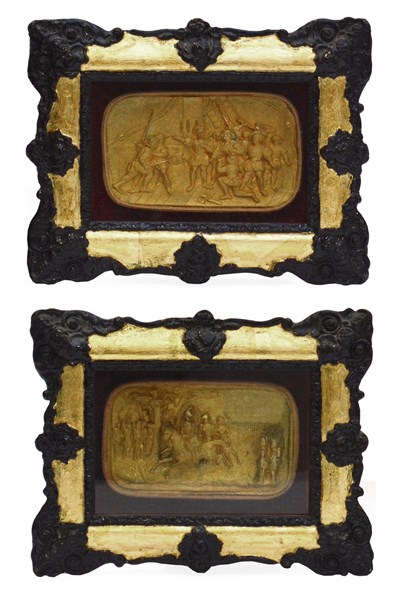 Coppia di altorilievi in metallo dorato raffiguranti scene di battaglia (cm 8x14) in cornici (difetti)