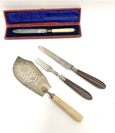 Lotto di quattro posate in argento con prese in legno e avorio, inizio secolo XX (difetti)