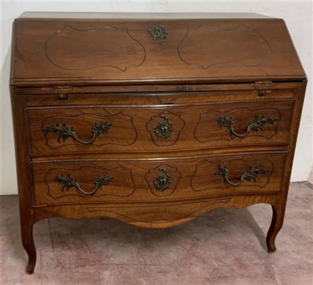 Antica ribalta piemontese con fronte mossa a due cassetti, calatoia celante sei